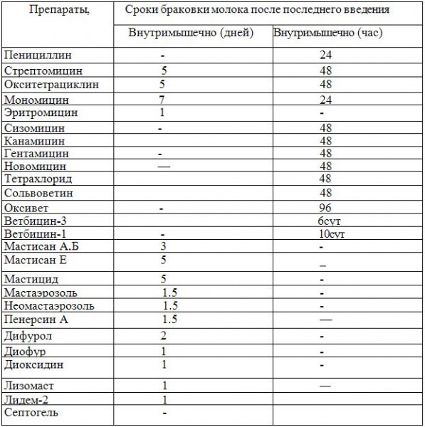 Сроки браковки молока определяются в соответствии с данными таблицы 1 и наставлениями по применению препаратов.