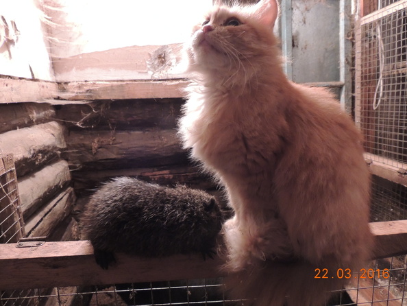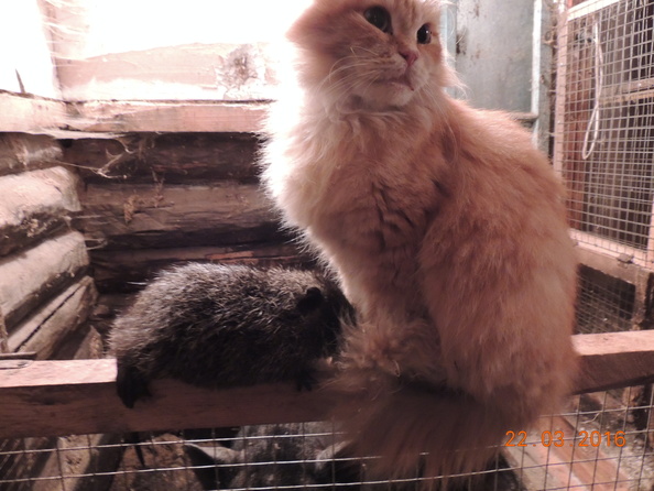 С мальком дивная история получилась:)вылез из клетки и лазит по полу, Муська думая что это мышь кидается к нему. Он же как доблестный нутряк , не побежал, а встал в стойку и как заорёт на неё