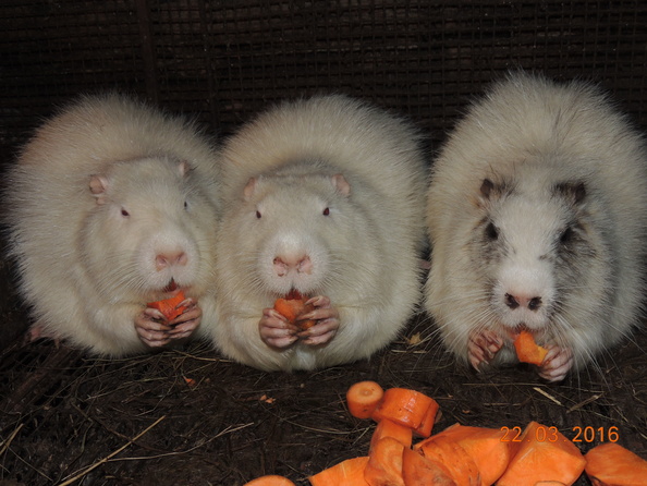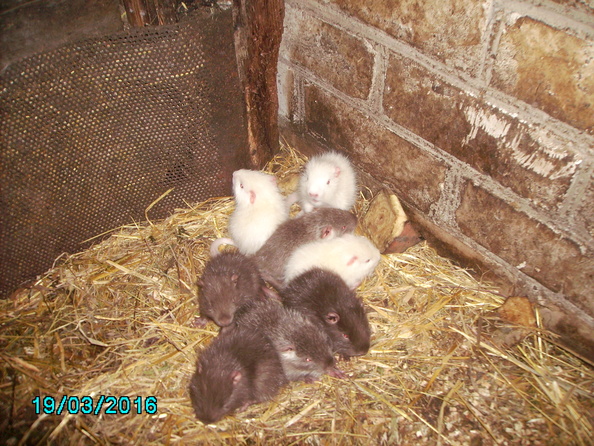Было так,девчонки пошли кормить зверьков утром,наблюдают картину,4 малыша с вспоротыми животами,и 1 задавлен ,через несколько дней моя звонит и говорит что должна родить стандартик самка,и она перестраховалась отсадила самку,это конечно правильно на 100%,отсадила и 20 марта родила 7 малышей,мамаша кормит малышей только с одной стороны,рычит защищает,хотя все 7 не поместятся и им не хватит сосков,наверно насмотрелась ужасов,а вчера моя взяла малыша и поднесла к черной которая издает писклявые призывные звуки зовет малышей так она целоваться лезла а когда к самцу поднесла он сразу кинулся укусит хотел,вот и думай,вот приеду думаю рокировку сделать и понаблюдать самца,и самок самку попробую к сестрам посадить если примут то пусть 2 и кормят,а ещё и 3 я должна через месяц родить так что ,понаблюдаю и сделаю выводы.