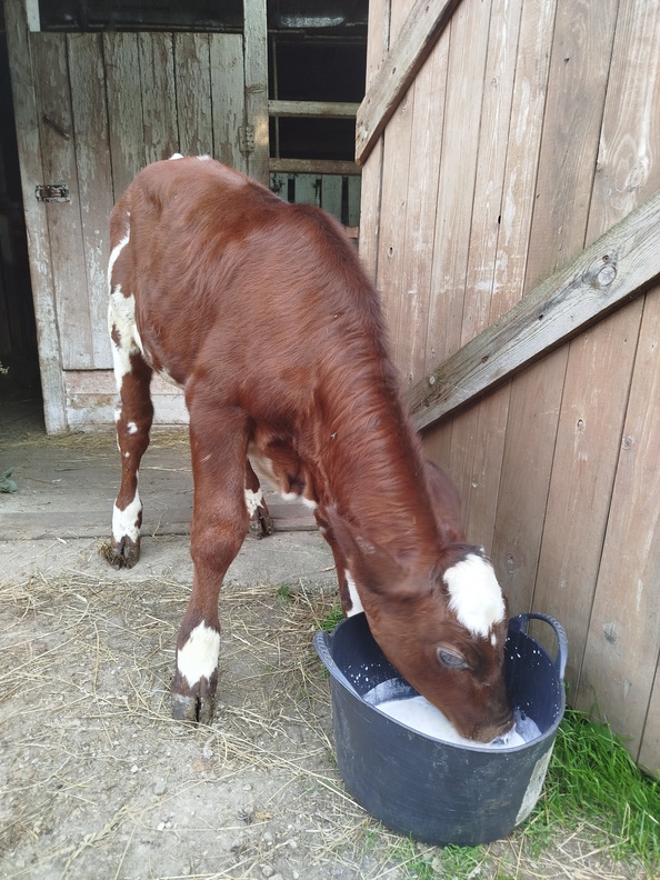 Корова телилась 17 мая, намечались с ней. Это наш первый опыт. Первоначально в четвером доили, был отек, потом осложнения после отела, ветеринар, уколы АБ и сейчас отошла. Даёт литров 15 молока. Телку хотим оставить на корову, тут ей на фото 3 суток