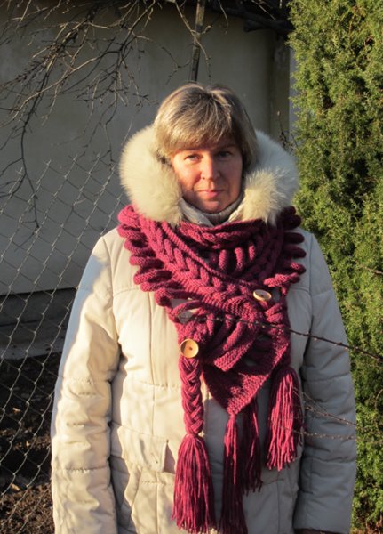 Начало процесса и готовый шарф, толком не знала как его завязать,потом приноровилась. Ну и .... заодно и сама покажусь, чтобы знали с кем общаетесь.