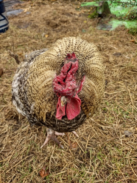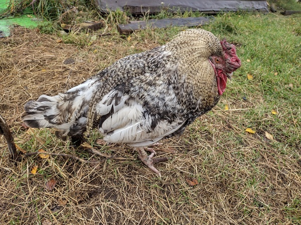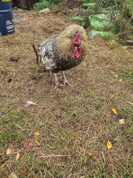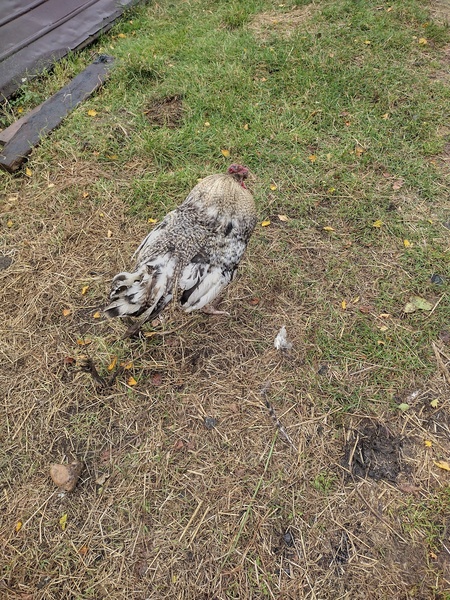 Один полностью белый, вывелся из своих поместных всяких кур кроссов в смеси с брамой.