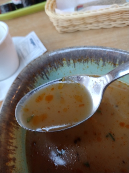 Это суп. Ложка молотого перца. Три кусочка гриба и одна креветка. Все. Больше ничего там нет. Я эту воду с перцем непонятного цвета съесть не могла.