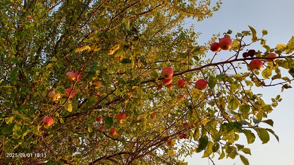 После обеда приехал тов. Пятница, и снова часа три загорал на моем пороге со смартфоном в руках. Затем он съездил в лес и привез рюкзак яблок. После чего полез на крышу и докрасил южный ее скат. Теперь отдохнет пару дней, и будет красить северный скат крыши, если не передумает конечно.