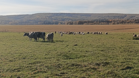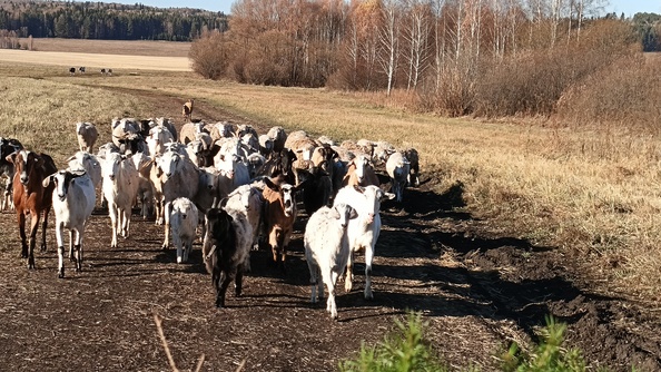 Как то сошлось мое стадо с деревенским. Переживала за быков. Оказалось напрасно. Быки подошли ко мне за козами. Коровы ваще абсолютно индифференты, они жруть. А вот с овцами случился полный капец. Смешанные овцы это нецензурно. Кое как отделили часть чужих овец и погнали в сторону дома с нашими. Ближе к дому они пришли в разум и разделились. Наши. Чужие рванули в деревню, домой.