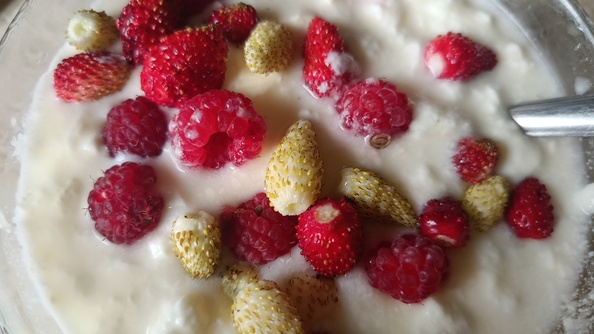 Малина разраслась, из перезимовавших 4 череночков. И привезла лесной. Прям пару метров от поля в лес наткнулись на медвежью кучу. Всю весну три медвежонка резвились на полях.... Поэтому малина пусть будет дома а грибы у нас перед лесом, маслята, мне хватает).