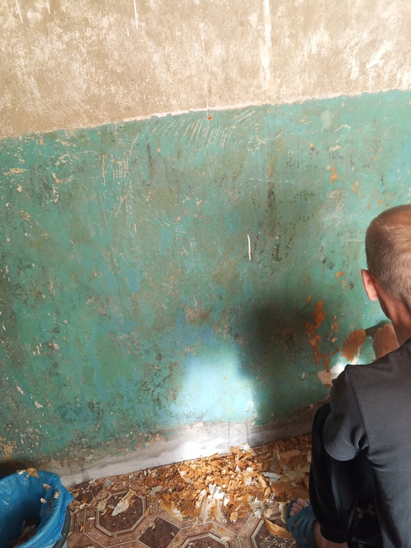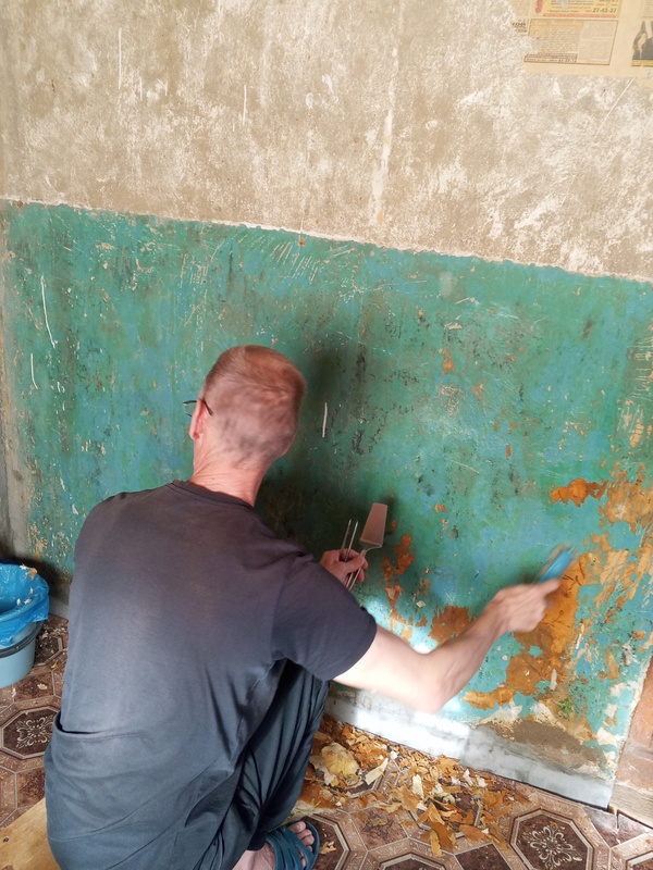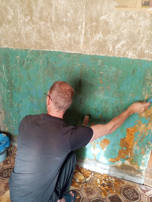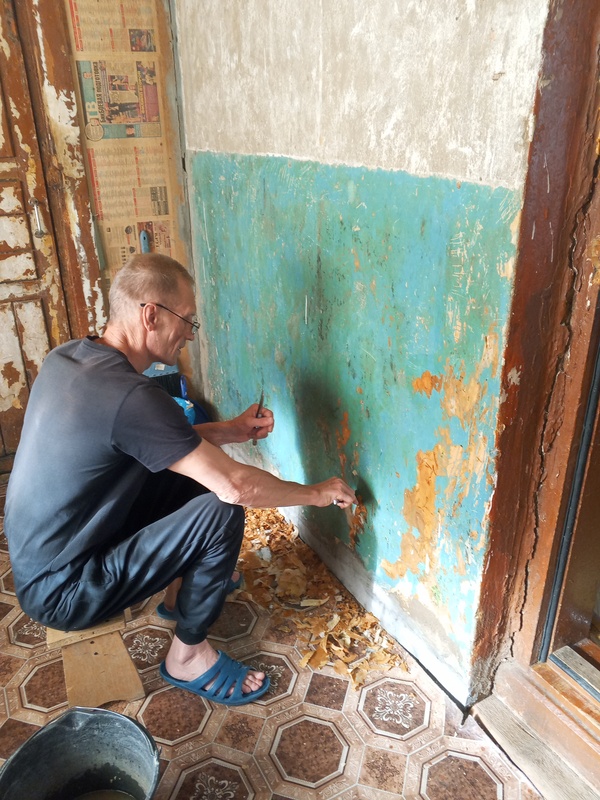 Дима занялся подремонтом веранды.. Очищает стены, двери от бумаги, что на них наклеена и потом покрасим всё, включая потолок..) Я ему дала кухонную лопатку, потому что шпатели где то есть, но он их найти не хочет, не может и сделал всю эту часть стены с пинцетом)))) а шпатели придется искать всеровно)