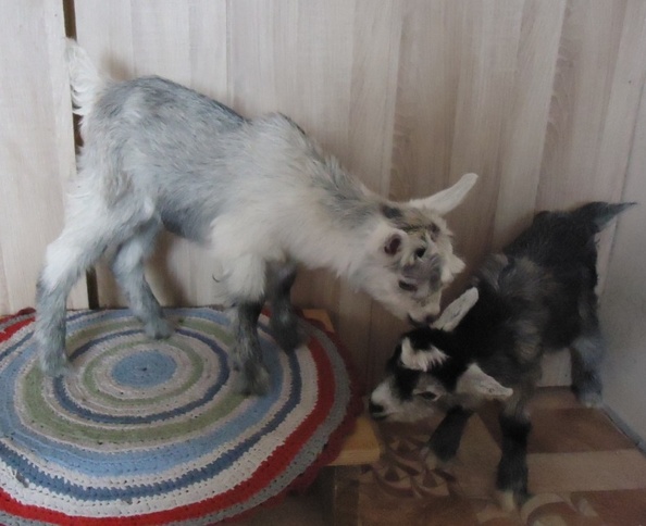 В нашем полку опять пополнение. Моя белоснежная зааненка принесла от заанено-альпийского козла вот таких цветных смешариков - козлика и козочку