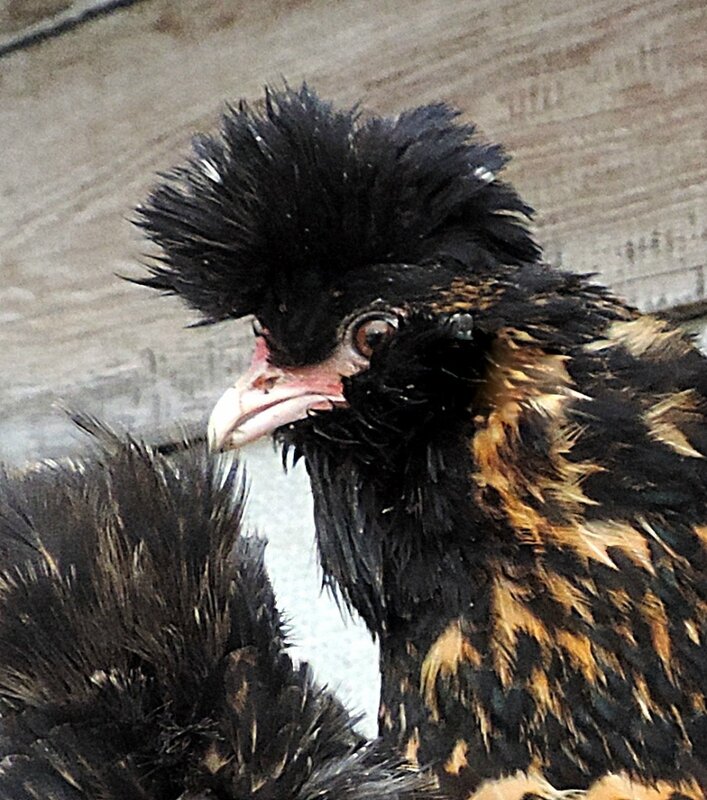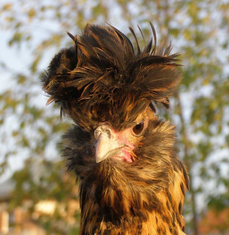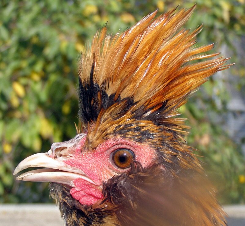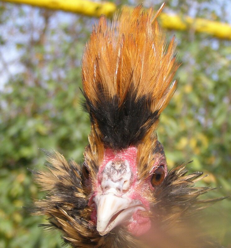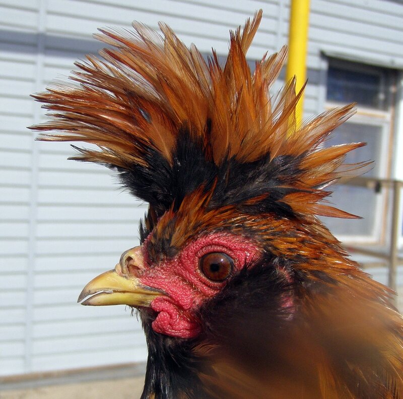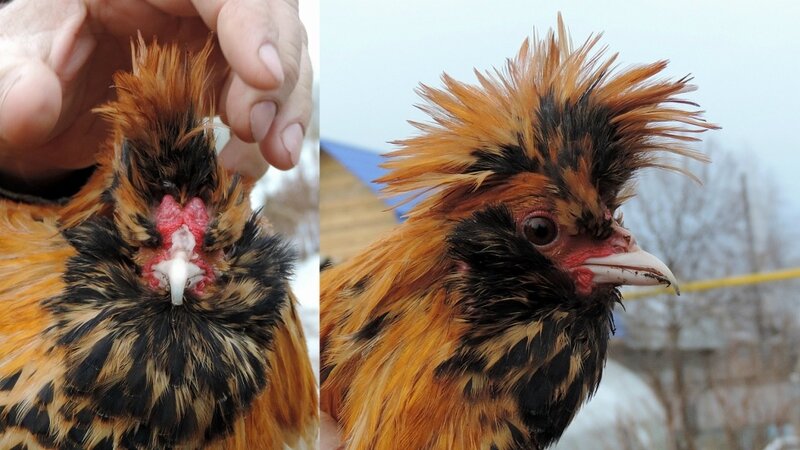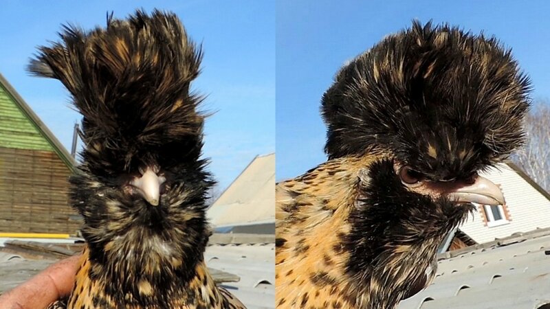 Хохол у кур довольно большой, в подборе т. е. имеет направление от затылка вперед; у петуха он меньше, строение хохла ШЛЕМООБРАЗНОЕ, хохол приподнят и на глаза не опускается.