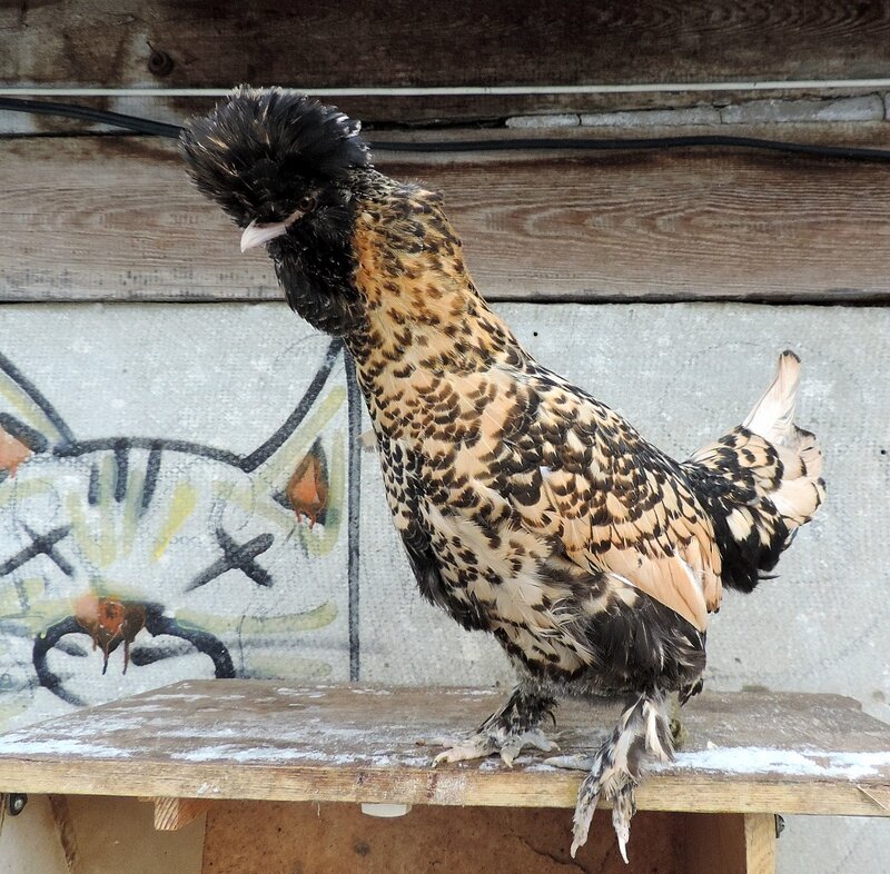 1899 - со своеобразным (в особенности у петухов, так называемым белым вуалеобразным хохлом). Отдельные перья петушиного хохла длинные, уже тоньше и мягче (чем перья у Падуанских) и не имея поэтому устойчивости они со средины головы ( с темени ) распадаются равномерно по всем направлениям опускаясь на затылок и лицо, при чём прикрывают и глаза. Окраска перьев хохла серебристо – белая, за исключением незначительной части (в особенности у курицы) близь клюва, которая окрашена смотря по оперению в чёрный или синий цвет) так же как у голландских, с которыми они сходны во всех отношениях за исключением хохла и желтоватых ног: так что предположение, что они с ними одного происхождения подтверждается (фото 3).