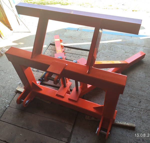 Рама корчевателя выполнена из профильной трубы 100х100х5 мм, усилена ребрами жесткости, косынками и распорками. Все пальцы и оси сделаны из металла марки Сталь 45. Корчеватель оснащен рамкой-толкателем для защиты кабины от падения деревьев. В подвижную часть зубчатого зажима вварена толстостенная втулка из металла марки Сталь 45. Ось зубчатого зажима имеет защиту от проворота. Толкающее усилие на штоках гидроцилиндров (сила сжатия зубчатых зажимов) 4 тонны. Вес корчевателя в сборе 170 кг.