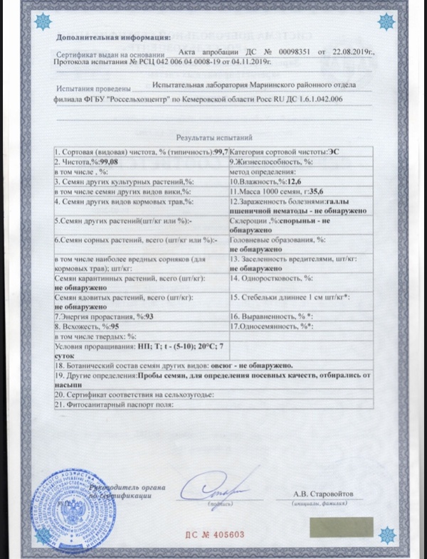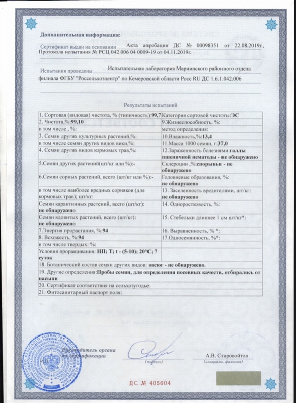 Прошла проверку ФГБНУ «Россельхоз центр по Кемеровской области» с выдачей соответствующих сертификатов соответствия по ГОСТ на всю партию.