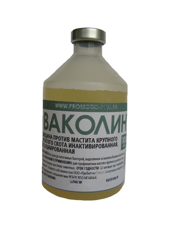 Вакцина ВАКОЛИН - предназначена для профилактики и лечения субклинических и клинических маститов у крупного и мелкого рогатого скота. Способствует освобождению вымени и организма в целом от возбудителей инфекционных болезней, циркулирующих в хозяйстве; повышает резистентность организма коров к заболеванию маститами и эндометритами, а у новорожденных телят создает колостральный иммунитет. Это единственная вакцина, способная вырабатывать антитела и эффективно разрушать защитную биопленку колоний бактерий возбудителей мастита, способствуя дальнейшему эффективному лечению субклинических и клинических маститов. Вакцина ВАКОЛИН вызывает формирование иммунного ответа к инфекционным маститам через 14 суток после двукратного применения продолжительностью не менее 9 месяцев.Не проявляется в молоке, т.к. это биопрепарат, безопасна, побочных реакций не выявлено.