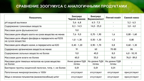 Содержание питательных веществ в зоогумусе «Львинка» более чем в три раза превышает содержание питательных веществ в популярных органических удобрениях на основе отходов животноводства, таких как навоз и помет.