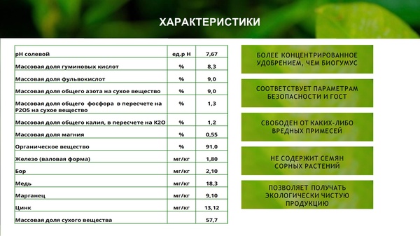 содержание органических веществ не менее 91% против 60% биогумуса;
