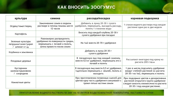 внесение зоогумуса в почву отпугивает луковую муху и луковую журчалку, снижает инфекционный потенциал возбудителей болезней, оздоравливает почву от корневой, серой, белой гнилей, возбудителя увядания.