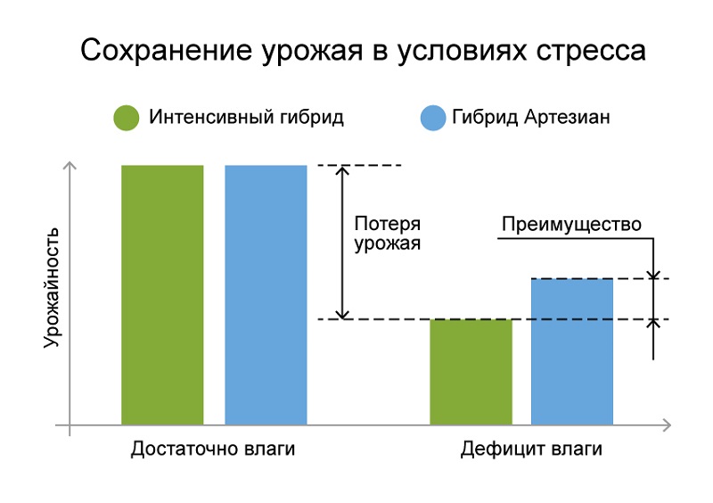 Особое внимание в процессе селекции уделили способности гибридов семейства АРТЕЗИАН™ эффективно использовать имеющуюся влагу на протяжении всего периода вегетации и преобразовывать собственные запасы биологической воды в зерно. Это позволяет получать максимальный урожай как в лояльных, так и в неблагоприятных условиях.