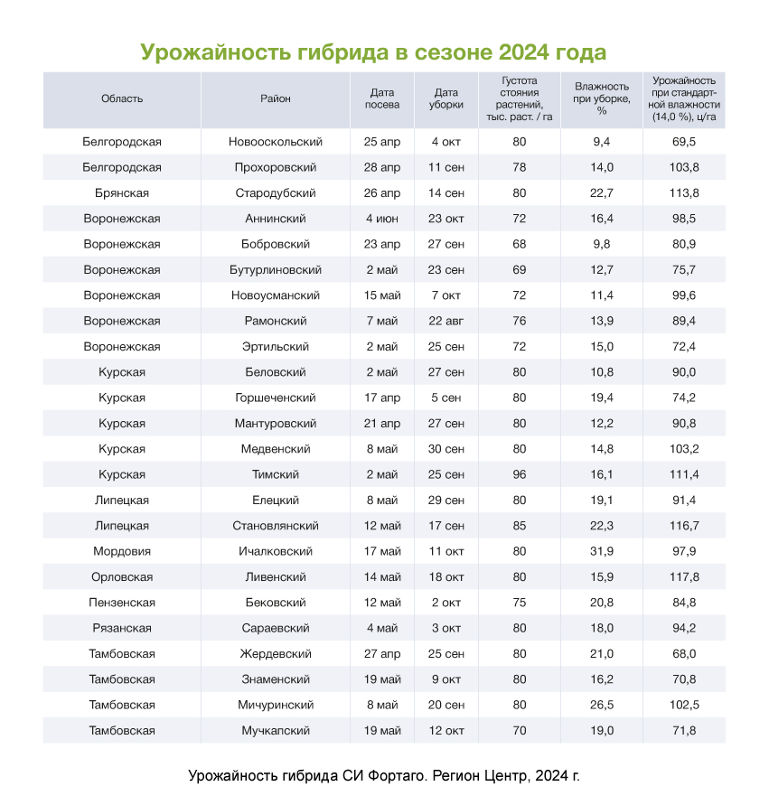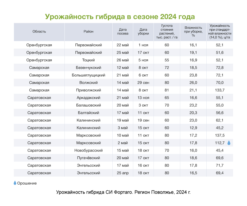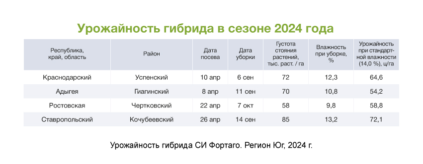 Благодаря своим свойствам гибрид СИ Фортаго отлично себя зарекомендовал в широком диапазоне агроклиматических условий, регионы его адаптации: Центральный, Центрально-Черноземный, Северо-Кавказский, Нижнее Поволжье, Западно-Сибирский, Дальневосточный. Его можно возделывать по классической, минимальной, нулевой технологии, стрип-тилл, на орошении.