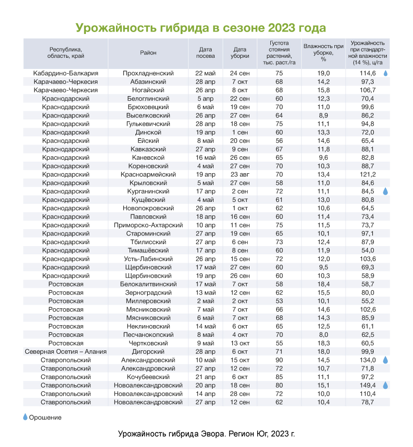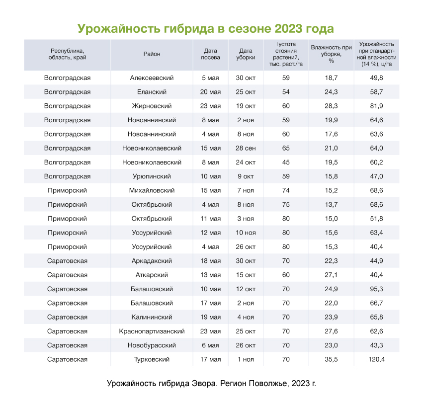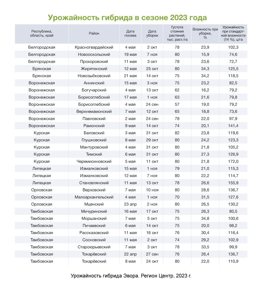 В своей группе спелости среднеранний гибрид Эвора показывает максимальную и стабильную урожайность в любых условиях выращивания. Он адаптирован для Центрального, Центрально-Черноземного, Северо-Кавказского регионов, Нижнего Поволжья и Дальнего Востока, подходит для разных технологий возделывания: классической, минимальной, на орошении, нулевой, стрип-тилл.