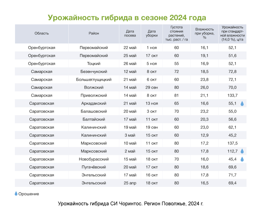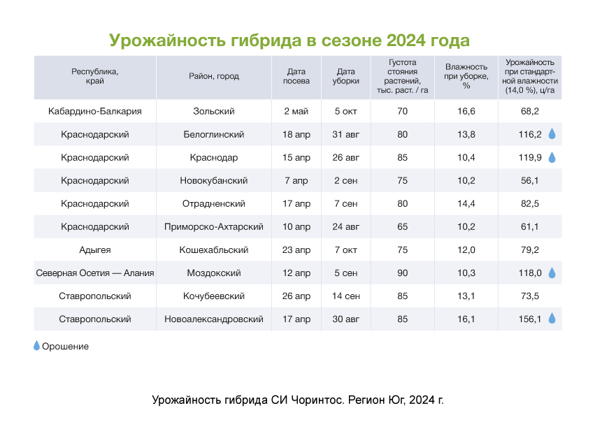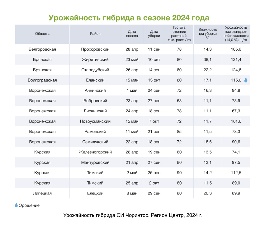 Среднеспелый гибрид СИ Чоринтос характеризуется быстрым развитием в начале вегетации и стабильно высокой урожайностью в природно-климатических условиях Центрального, Центрально-Черноземного, Северо-Кавказского, Нижневолжского, Дальневосточного регионов — всё благодаря отличной засухо- и жаростойкости: при обильном выпадении осадков гибрид дает максимальный урожай, в засуху демонстрирует высокую толерантность к высыханию и выносливость, минимизируя потери.