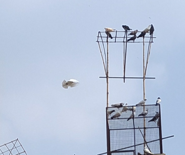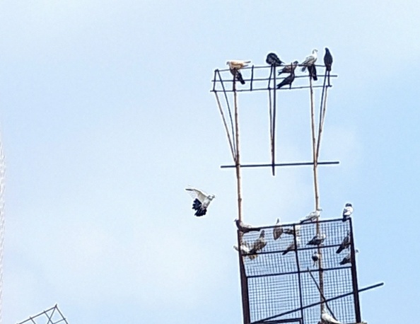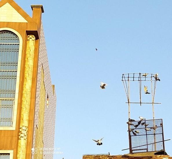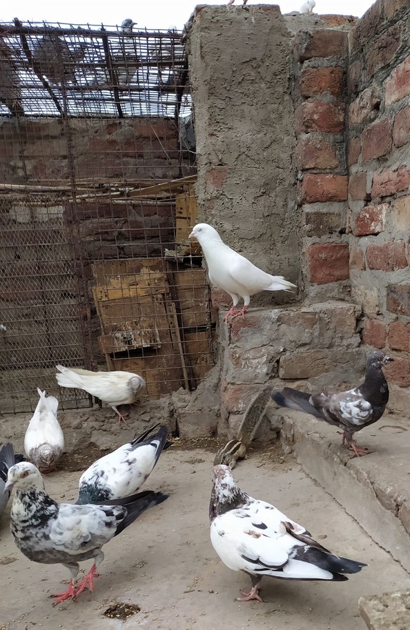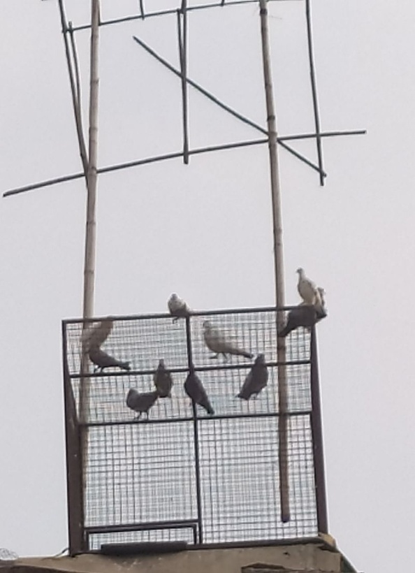 ...Подождали и определили  место  площадки на верхотуре древнего трехэтажного дома. Там,- владельцы прекрасных птиц. Познакомились. Один из них, на крыше, отгонял шестом вездесущих обезьян, что стремились к корму летунов. Другой,- показал гнездование голубиных пар.