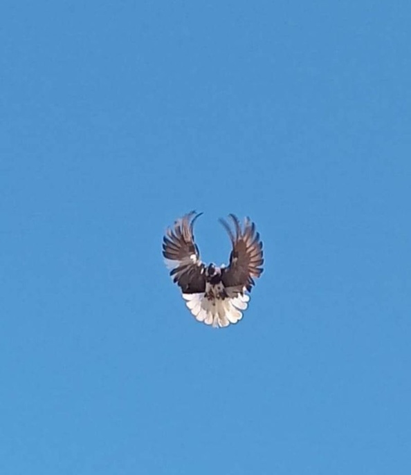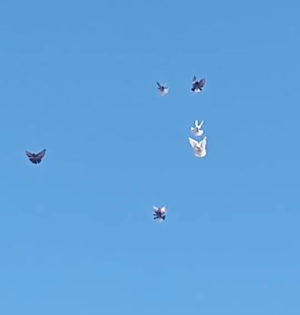 ...Небесная стайка пошла на посадку. На наших глазах, один из летунов, с высоты, "вырулил" к голубятне-дому,- и...плавно опустился на плечо хозяину, отдышаться. Как в фильме "Любовь и голуби" уникального режиссера  Владимира Меньшова. Удивлению не было предела.