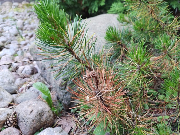 Это сосна родителей, говорят, не поливали, не удобряли. Проверила землю - очень влажная, там много тени, весь июнь было холодно и дожди. Сейчас просушиваю. Прочла про болезни сосен, вроде на шютте не похоже, возможно, гипоксия корней с переувлажнением...