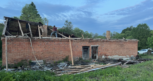 Мальчишки из соседней деревни разобрали крышу, и когда работал трактор занимались сортировкой камня и дерева. Сиё мероприятие вышло недорого. Сотня тысяч за всё.