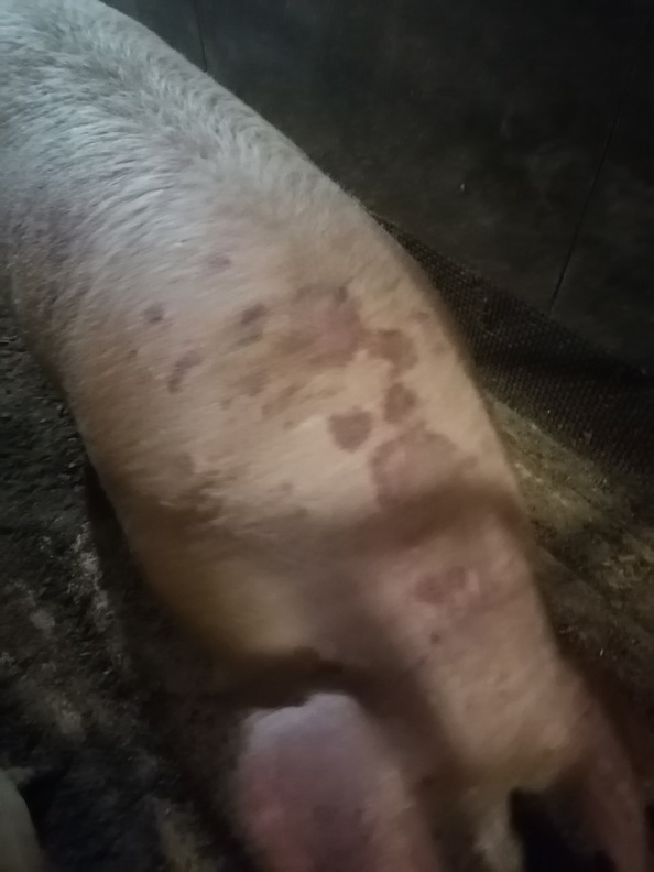 На спине у свиньи появились пятна. Фото. Признаков вялости не выказывает, ест нормально