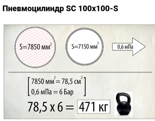 Усилие на штоке при 6 бар в пневматике : 78,5 х 6 = 471 кг. Можно решить и обратную задачу.