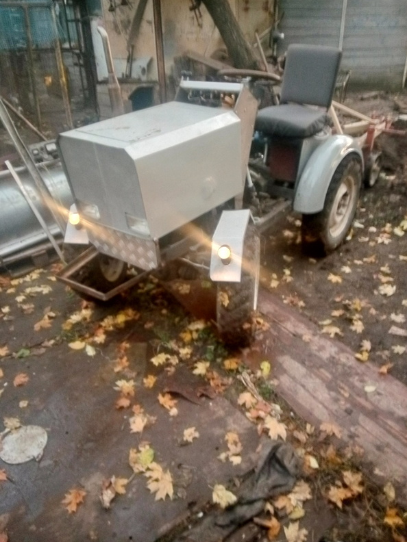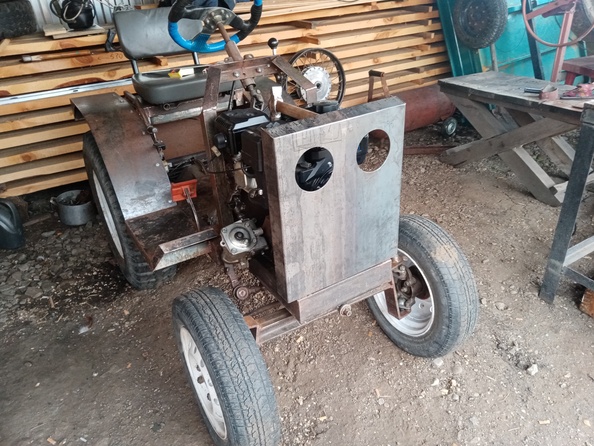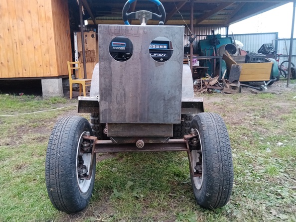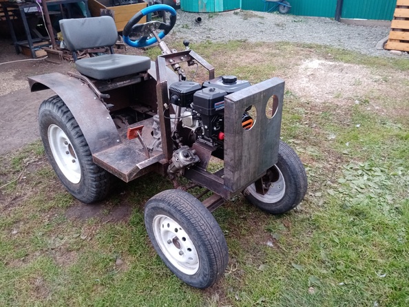 Обрезал полуось мост Волга 24 пропилил паз в одной и сделал папу в другой. Варили правда на Воронежском заводе мостостроения. Колёса ёлочка 20 радиуса. П ось жива. Таскал столбы ЖБ по 8 м. Плуг и окучник так игрушки. Мотор зид. КПП ваз.