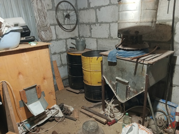 Закром для зерна в кормоцехе из 200-х л бочек, разрезанных вдоль и весь закром из 3-х бочек , на 3 отсека. Кг 250+каждый таскать полупустой прицеп так себе мысля. А насыпать все в одну кучу, тоже не вариант. Рецептуру соблюдать надо [изображение] и возить мне со склада 350 м от дома