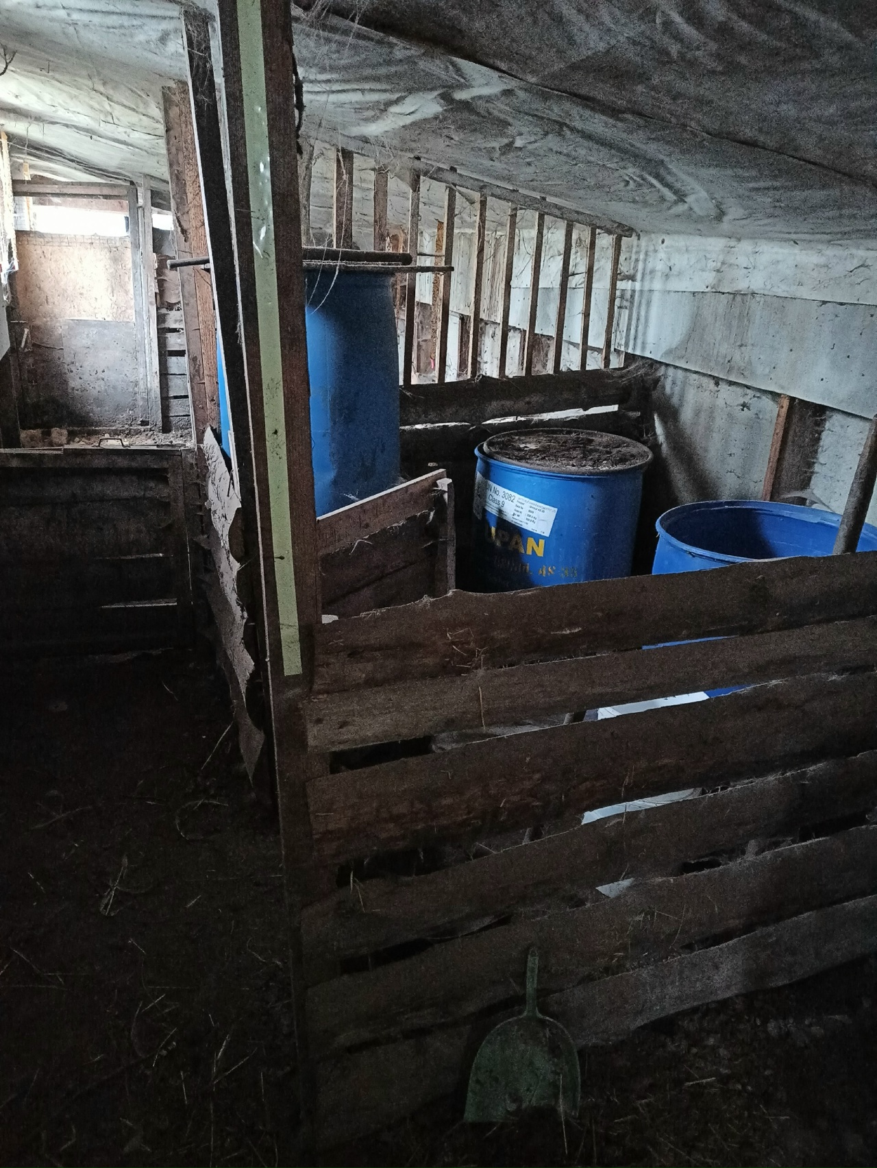 Идем дальше. Тут загородка для поросят, которые готовятся переехать в морозилку. Сейчас там бочки с кормом.