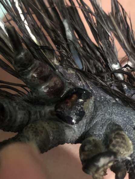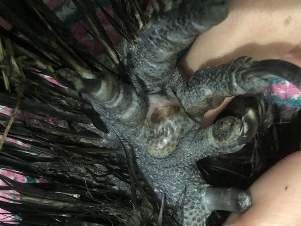 Китайский шелк петушок 1,5 лет, на прошлой неделе были обнаружены кровавые капельки на полу. Спустя пару дней в результате осмотра были обнаружены такие вздувшиеся мозоли. Живет дома на сене (сено на впитывающей пеленке, пеленка на линолеуме) в картонной коробке 60х70см с курочкой, гуляет на лоджии и в целом по квартире (пока что зима). Ест корм для декоративных кур, фрукты, овощи, очищенные семки не соленые. Но стал очень самостоятельный и спрыгивает со спинки стула на котором утром орёт. Подскажите, это ушиб или что-то еще? По поведению не изменился, носится везде, прыгает, гоняет кота, топчет куру. Пока обработала хлоргексой+ левомеколь гель, заклеила тканевым пластырем во избежание загрязнения.