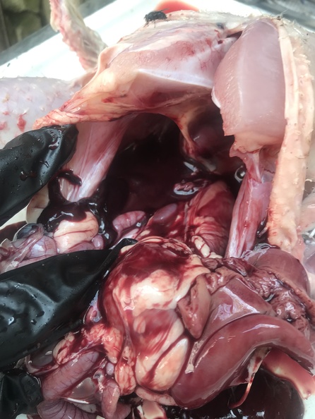 Подскажите пожалуйста, может кто-то сталкивался с таким случаем? За неделю потеряла четырёх бройлеров, возраст 35 дней. Симптомы: сидит нахохлившись, не ест и не пьёт, понос бледности желтый, водяной, без пены и слизи, дышит часто, не хрипит. Умирают быстро в течении суток-двух. При вскрытии обнаружила большое количество кровяных сгустков в брюшной полости, все органы вроде в норме (прикладываю фото). Птицу выращиваю впервые, в клетках, кормлю качественным комбикормом, вода меняется дважды в день. Может у кого была такая проблема или на форуме есть ветеринары? Подскажите пожалуйста что за напасть?? Спасибо