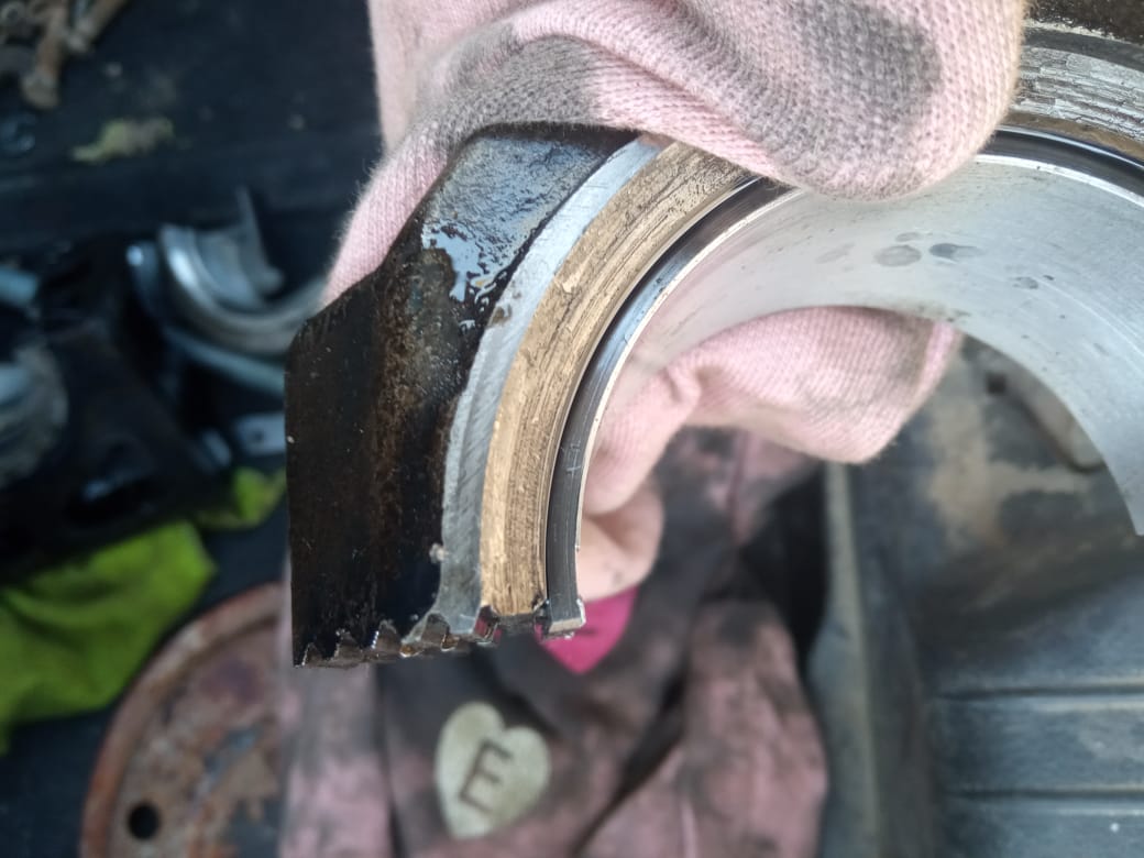 ну вот где вкладыш с боку потёртый даже как будто куски по отлетали и примерно такие куски и обнаружил .Когда крышку шатуна снял то вкладыш был сдвинут на фото видно .