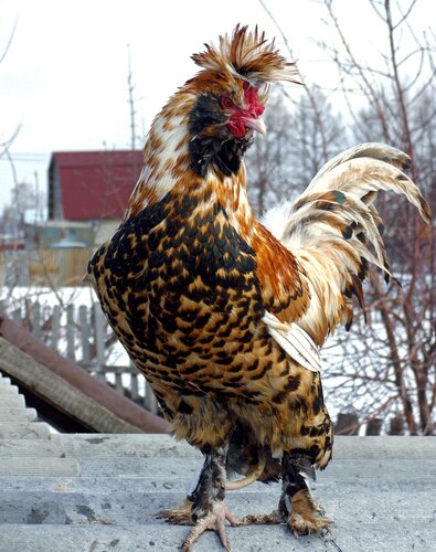 Например, есть один петушок с великолепной круговой, павловской оперенностью плюсны, "мягким", загнутым внутрь ястребиным клоком. И это его достоинство настолько перевесило имеющиеся недостатки, что петушок оставлен для разведения несмотря на вопиющий недостаток - отсутствие бороды.