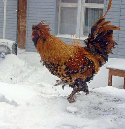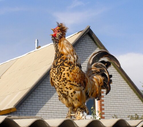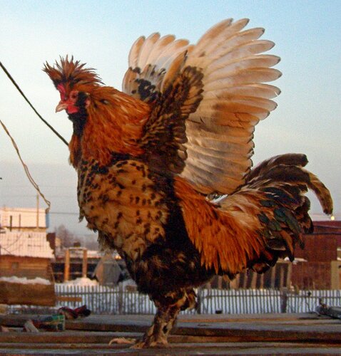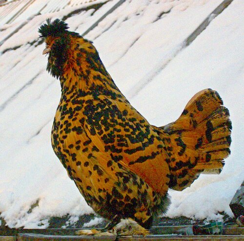 ... С хвостом тоже не всё до конца понятно, кроме того, что он не должен быть одноцветным черно-зеленым...,а должен быть как у гамбургского петуха, но такового золотистого окраса, я не видел... даже на фото. Приходится довольствоваться описанием 1899 года. У Вашего старичка хвост на 5 с+.