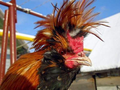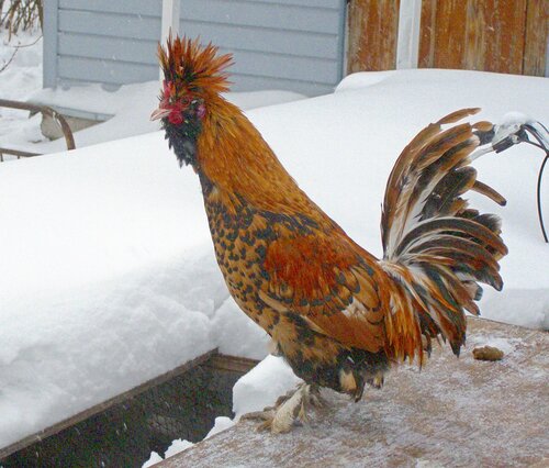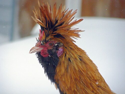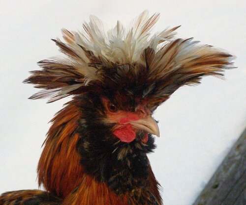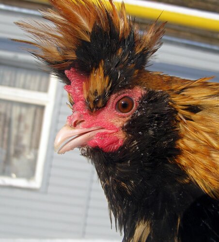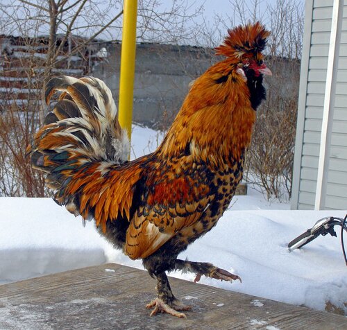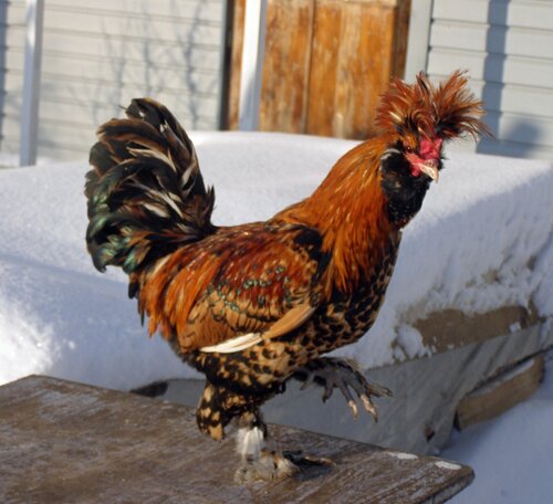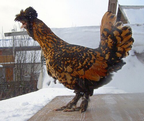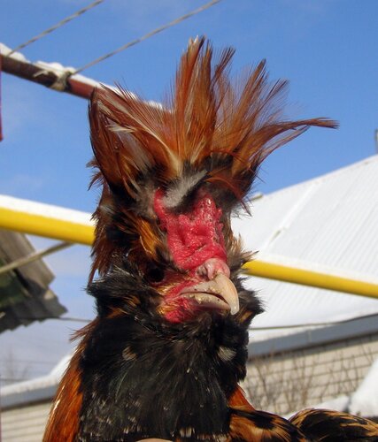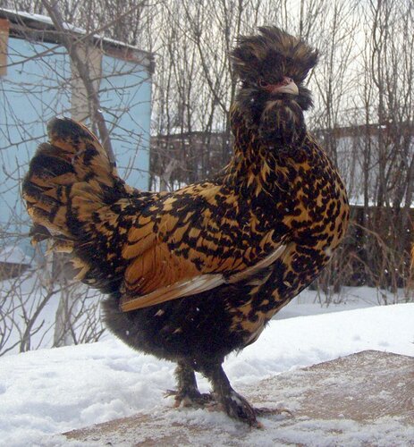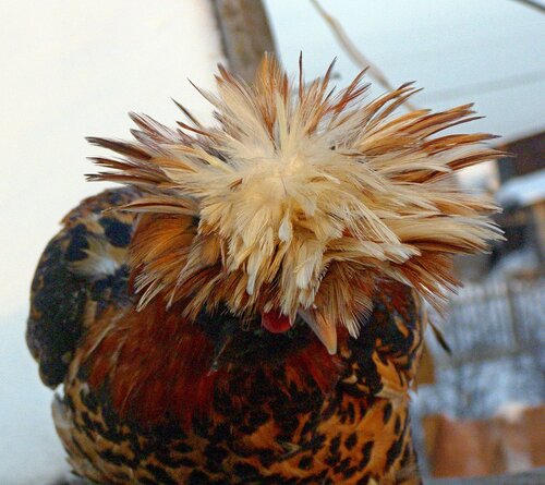 У курицы хохол более развит, чем у петуха, шарообразной формы, но не за-крывает глаза, с зачесом назад и состоит из перьев, подобных перьям гривы.