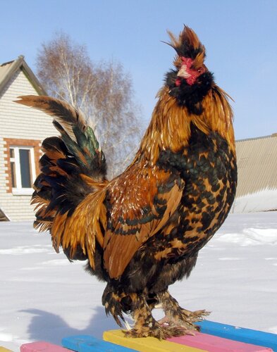 С шлемообразными хохлами. Основной цвет оперения должен быть красивый серебристо-белый, за немногими отступлениями соответствует рисунку золотистых кур. Но и здесь махи и хвост оставляют желать очень многого. Часто нижние махи белы. А верхние с чёрными крапинами. И т. д. Желательно, чтобы перья хвоста были белыми с чёрными на концах пятнами. Но достигнуть этого пока оказывается не возможным и мы всегда вынуждены довольствоваться серыми и черными оттенками, при чём ввиду того, что это основано на естественном распределении красок нельзя даже считать это недостатком в красоте. Жёлтый цвет в оперении петуха, слишком светлая борода, грудь с неясными и неправильными пятнами и т. д. считается за недостаток красоты.