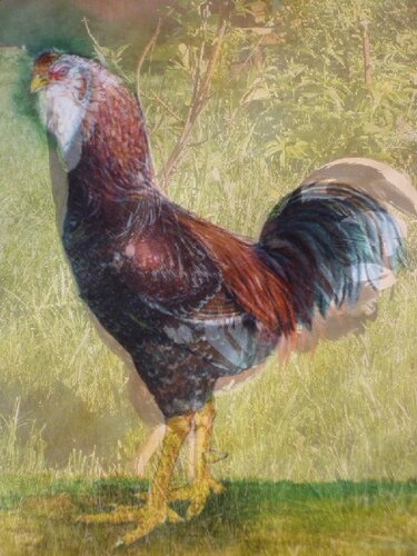 Наш петух рядом с картиной Бориса Степановича.Прошу полюбоваться. Фото молодого петуха можно посмотреть на смотре орловских.А вообще то,Саша.by ,Вы не ответили на моё письмо относительно судейства на выставке. Нехорошо.