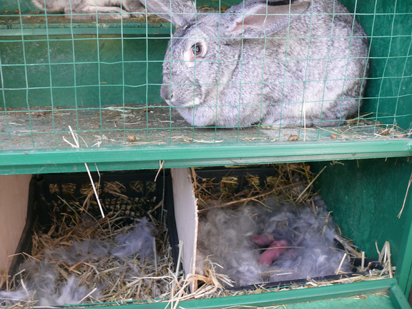 Прошёл ровно месяц с момента, как "подружил" четырёх крольчих с самчиком и заселил их в клетку новой конструкции. Сегодня с утра 8.04.2014 обнаружил в новой клетке первый окрол. Состояние гнезда удовлетворительное. Будем надеятся, что в течении 3-4х дней остальные крольчихи, последуют этому примеру.