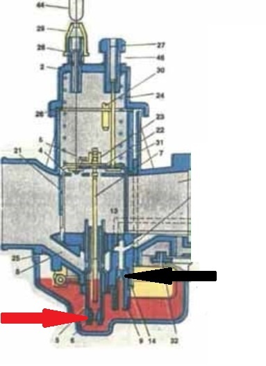 Кстати - у карбюратора на фото/видео выше рассверленные топливные жиклеры. Топливный жиклер холостого хода (показан чёрной стрелкой) - рассверлен до диаметра 1 мм, главный топливный жиклер (показан красной стрелкой) - до диаметра 1,5 мм. Дозирующая игла поднята максимально высоко.
