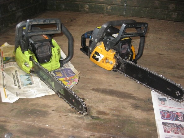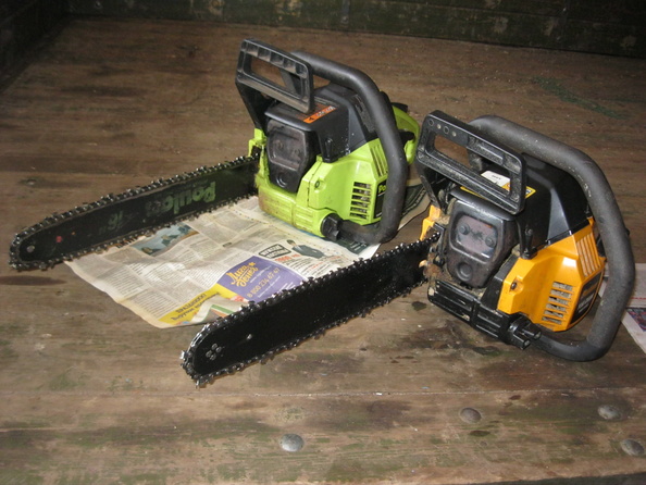 Вообще-то, у меня есть две полностью работоспособные пилы, почти полностью в заводской комплектации (см. фото). Используются в основном для плотницких работ, и для работ в лесу. Плюс есть ещё один Партнёр - но он без масляного насоса, и на нём вместо звёздочки установлен ременный шкив (для работы с приставками)