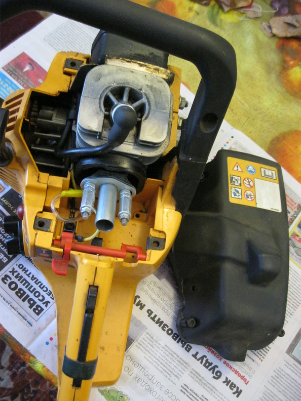 Карбюратор, воздушный фильтр и топливный бачок будут смонтированы отдельным компактным блоком, который при работе пилы будет держать в руках другой человек