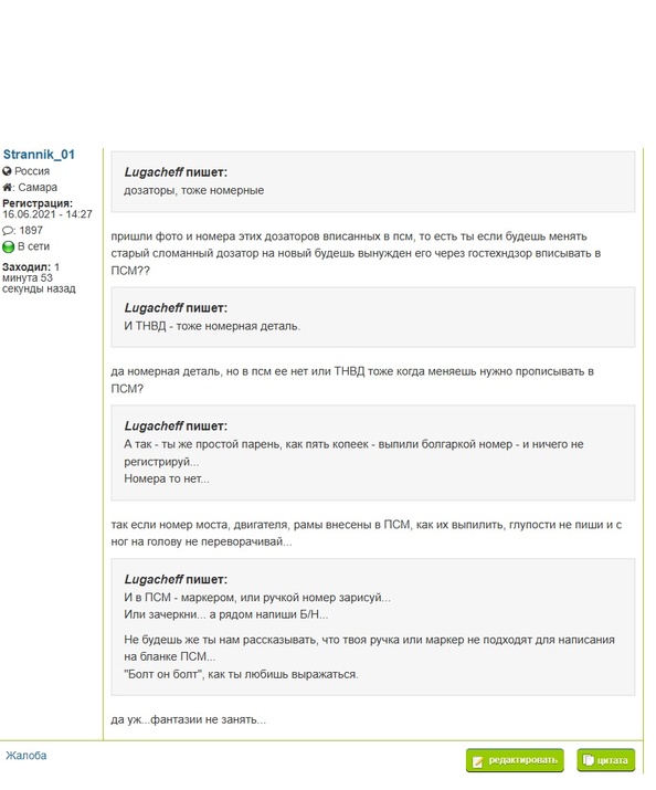 ты не ответил на вопрос о формуляре и инспекторе, а значит мои догадки верны, ты его со дня приобретения ему не показывал и знать не знал что там в нем написано и инспектору на него глубоко наплевать, так же как и на твой дозатор или гур им глубоко до лампочки ибо они знают что с завода стоит либо та либо либо другая конструкция и смысла вести разговоры даже нет, так же как и про ТНВД которые ты вдруг решил поменять поставив на д 240 ТНВД от Д 243, так как это заводские узлы и детали которые не нужно регистрировать в органах гостехнадзора это запасные части и ты сам вше это признал, но ты сейчас это понял и решил вывернуть разговор и кидаешься пустыми обвинениями, смысла ведения дальнейшего диалога с тобой я не вижу...