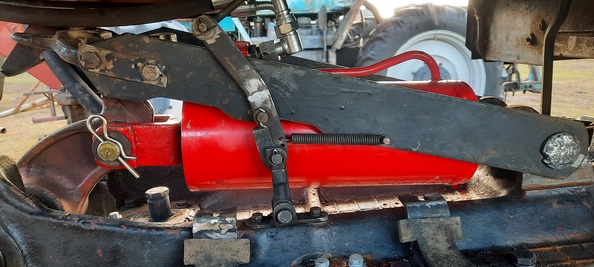 Так называемый догружатель. Получился не совсем такой как хотел. Не было металла пошире и подлиннее. Тогда бы можно было еще ниже продолжить и пошире. Пальцы сделал из пальцев гусеничной ленты ДТ-75. Трубки толстостенные. Нашел удачные по диаметру и толщине стенки. Палец плотно входит. Пластины под трубки так же сверлил фрезой, под верхнюю трубку и под нижнюю. Через пластины трубки проходят насквозь и поэтому сварочные швы по обе стороны пластин. Делал для того, чтобы если верхнюю тяги цеплять за нижние петли, тогда эта тяга постоянно по пальцу гуляет. При этом одну стороны петли уже выгнуло тягой наружу