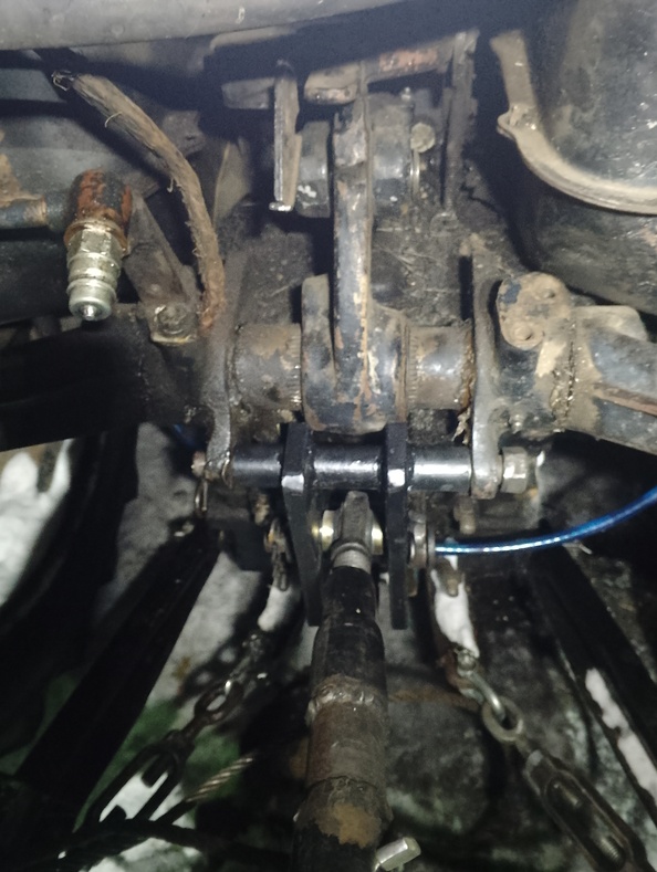 Можно было бы добавить тяги от МТЗ 1221. Они крепятся снаружи тяг и к чулкам моста. Но там нужно ставить кронштейны на чулки снизу. Нужны для того, чтобы концы растяжек крепились на одной линии с нижней осью навески. Иначе можно порвать навеску. В общем центр движения полуокружности растяжек, совпадать с осью этих тяг. Я эту ось заменил, втулки тоже перебил