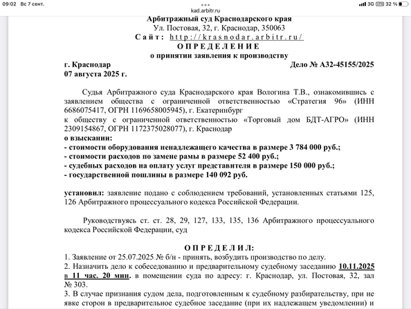 Судебное дело № А32-45155/2025 действительно принято к производству, но оно не лишает нас права рассказывать о фактической эксплуатации техники, которая принадлежит нам.