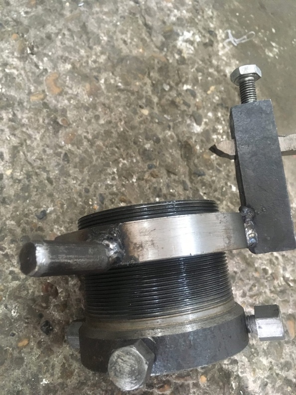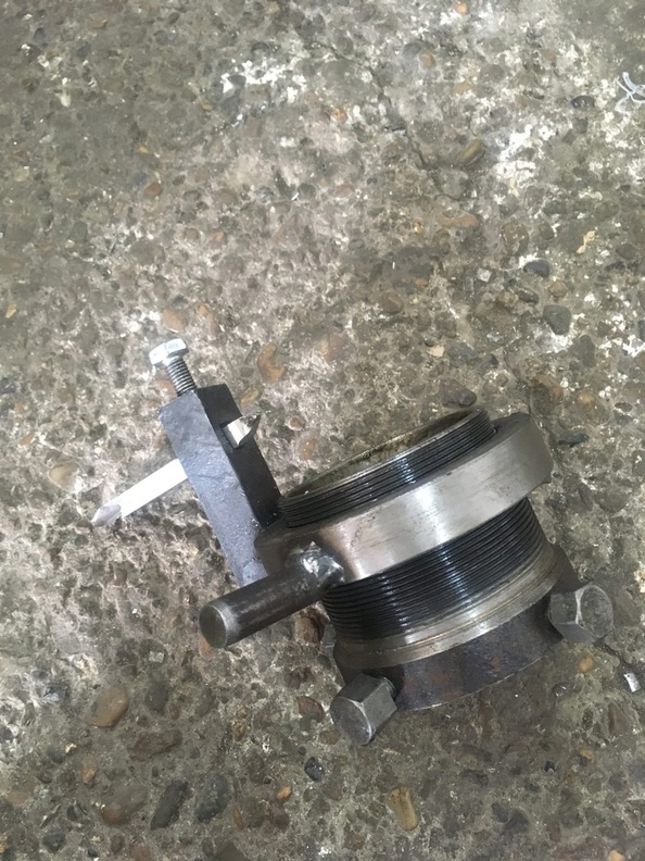(Располовинь гайку маленькой болгаркой (от нее пропилы тоньше), сделай фаски, поставь половинки на ось, прихвати по размеру , а после свари их между собой, без фанатизма)
